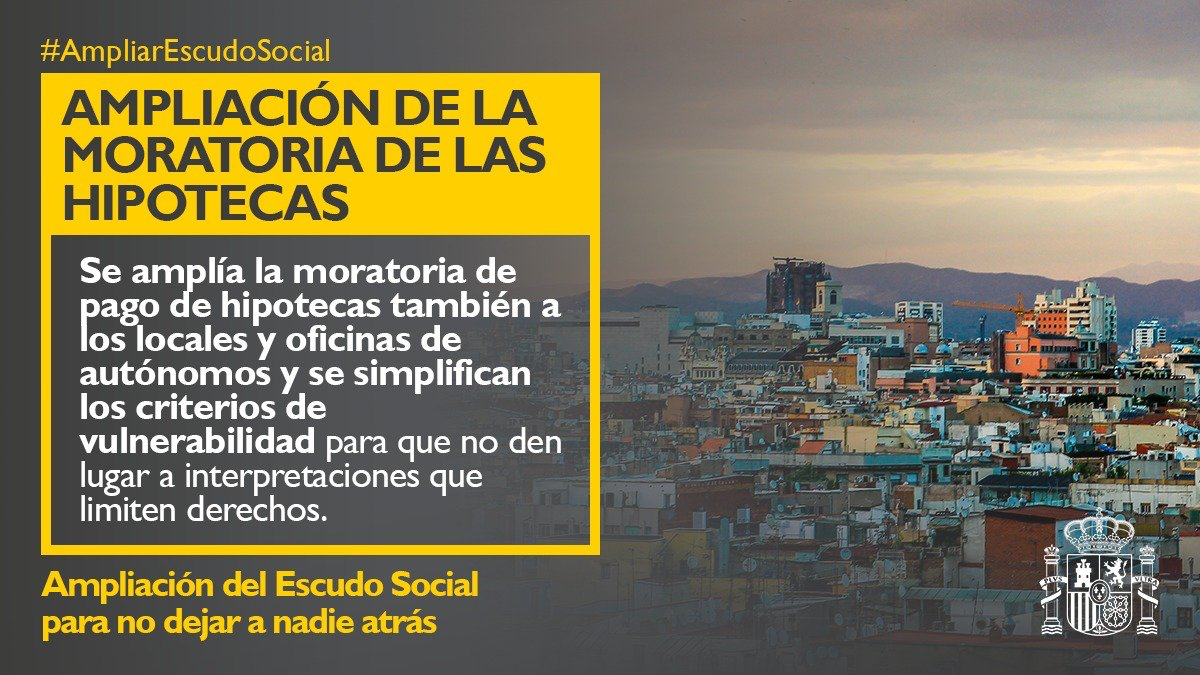El RDL aprobado hoy por el #CMin para contrarrestar el impacto social y económico del COVID-19 amplía la moratoria en el pago de las hipotecas.